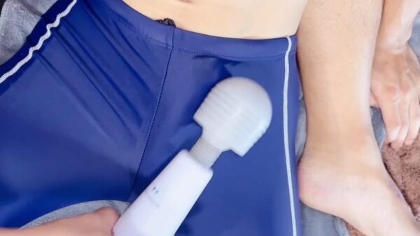 スク水の上から電マを当てると電マの快感にびっくりのりん君。気に入ってもらえたようですw